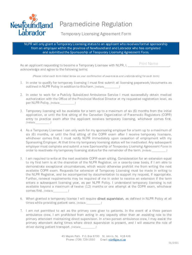 Para medicine Regulation Temporary Licensing Agreement Form NPR will only grant a Temporary Licensing status to an applicant who receives formal sponsorship from an employer within the province of