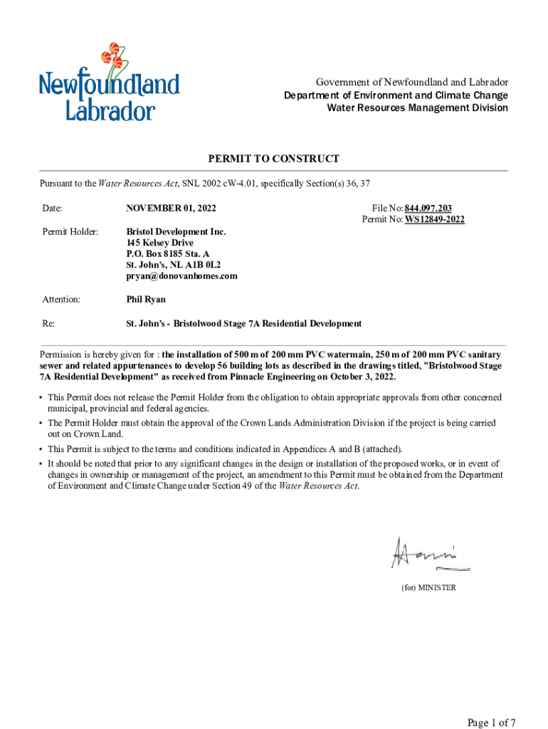 Government of Newfoundland and Labrador Department of Environment and Climate Change Water Resources Management DivisionPERMIT TO CONSTRUCT Pursuant to the Water Resources Act, SNL 2002 cW4.01, specifically