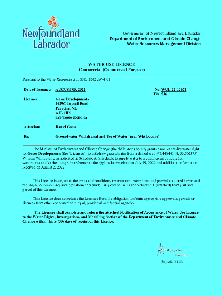 Government of Newfoundland and Labrador Department of Environment and Climate Change Water Resources Management DivisionWATER USE License Commercial (Commercial Purpose) Pursuant to the Water Resources