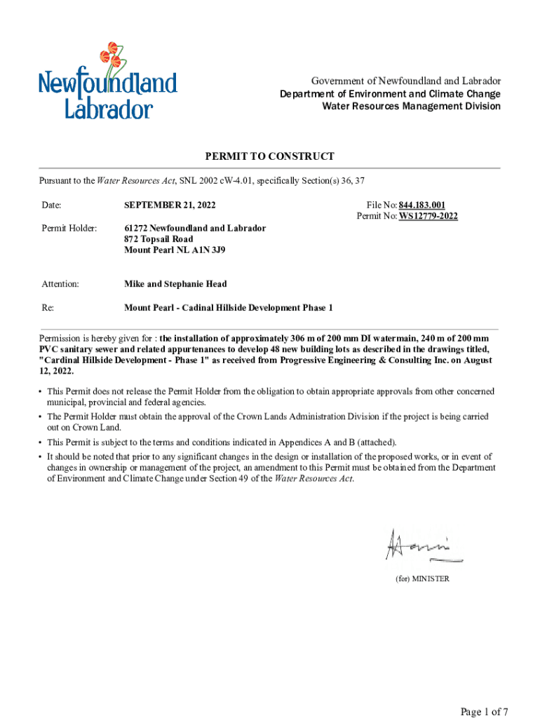 Government of Newfoundland and Labrador Department of Environment and Climate Change Water Resources Management DivisionPERMIT TO CONSTRUCT Pursuant to the Water Resources Act, SNL 2002 cW4.01, specifically