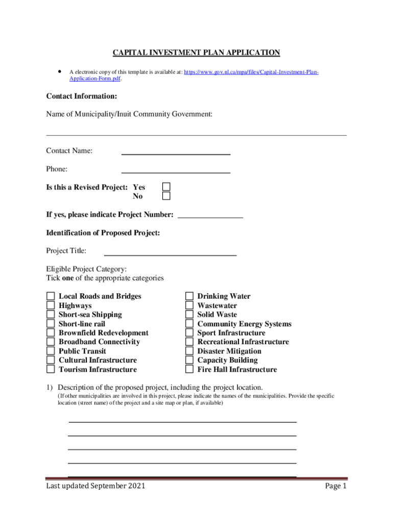 CAPITAL INVESTMENT PLAN APPLICATION A electronic copy of this template is available at: https://www.gov.nl.ca/mpa/files/CapitalInvestmentPlanApplicationForm.pdf. Contact Information: Name of Municipality/Inuit