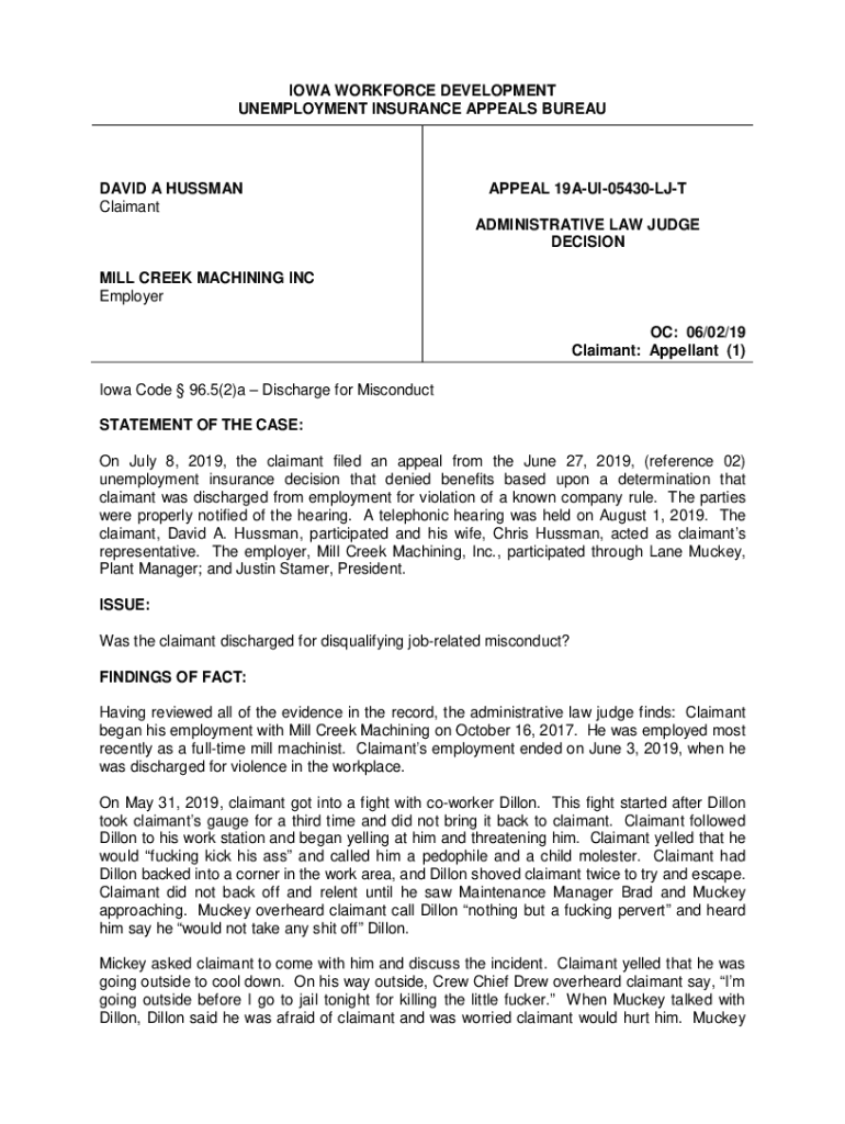 IOWA WORKFORCE DEVELOPMENT UNEMPLOYMENT INSURANCE APPEALS BUREAUDAVID A HUMAN ClaimantAPPEAL 19AUI05430LJT ADMINISTRATIVE LAW JUDGE DECISIONING CREEK MACHINING INC Employer OC: 06/02/19 Claimant: