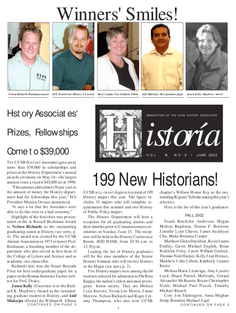 Winners\' Smiles! Nelson Richards: Buchanan Award Erik Maelstrom: History TA Award Mary Lamp: Van Gendered FellowHistoryAssociates Prizes, Fellowships Come to $39,000 THE UCSB HISTORY Associates gave