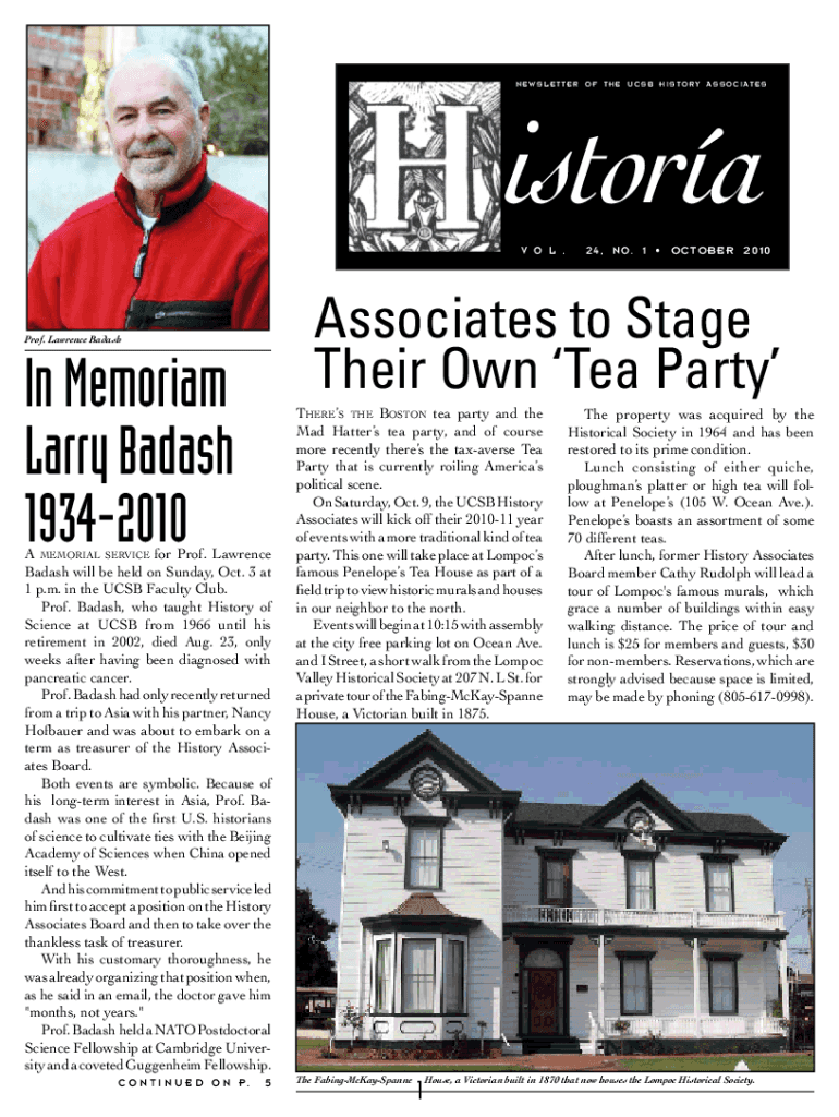 N e w s l e t t e r o f t h e U CSS H i s t o r y A s s o c i a t e history V O L. Associates to Stage Their Own Tea Party Prof. Lawrence Basin Memorial Larry Ba dash 19342010A memorial service for