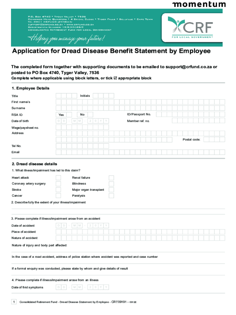 Application for Dread Disease Benefit Statement by Employee The completed form together with supporting documents to be emailed to support@crfund.co.za or posted to PO Box 4740, Tyler Valley, 7536