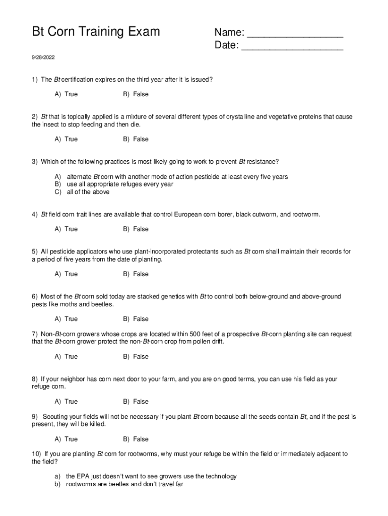BT Corn Training Edamame: ___ Date: ___9/28/20221) The BT certification expires on the third year after it is issued? A) True) False2) BT that is topically applied is a mixture of several types of