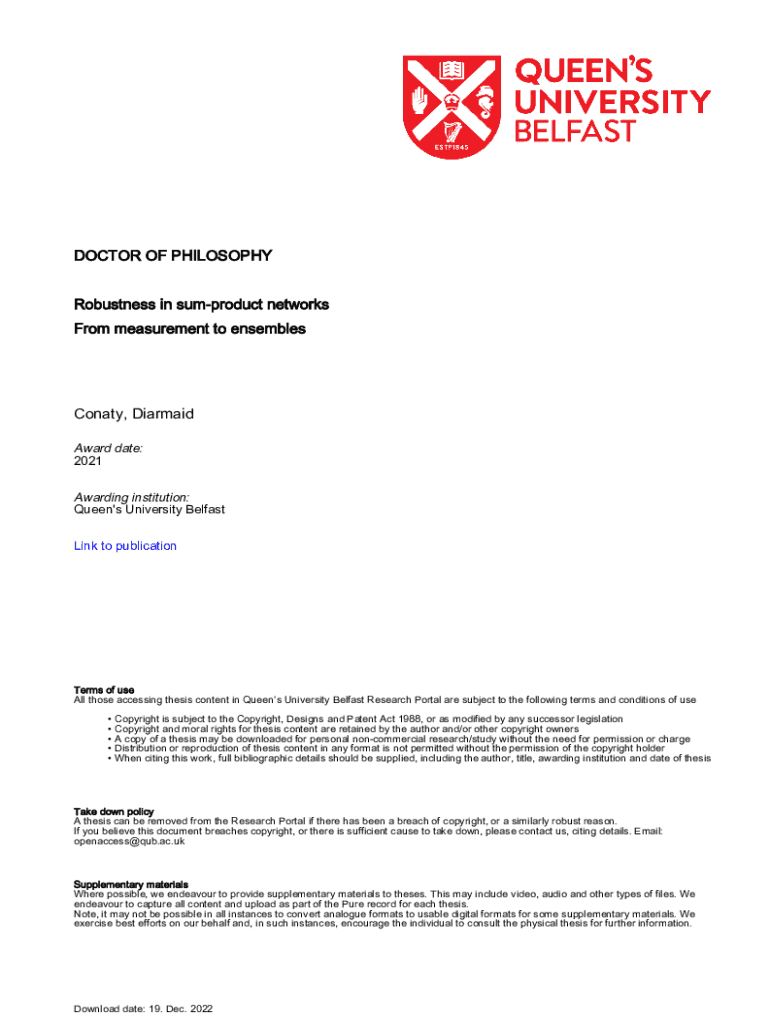 DOCTOR OF PHILOSOPHY Robustness in sum product networks From measurement to ensemblesConaty, Barmaid Award date: 2021 Awarding institution: Queen\'s University Belfast Link to publicationTerms of