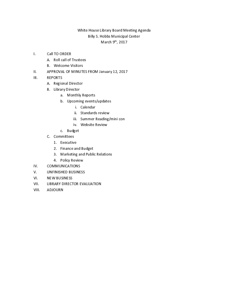 White House Library Board Meeting Agenda Billy S. Hobbs Municipal Center March 9th, 2017 I.II. III.IV. V. VI. VII. VIII. Call TO ORDER A. Roll call of Trustees B. Welcome Visitors APPROVAL OF MINUTES