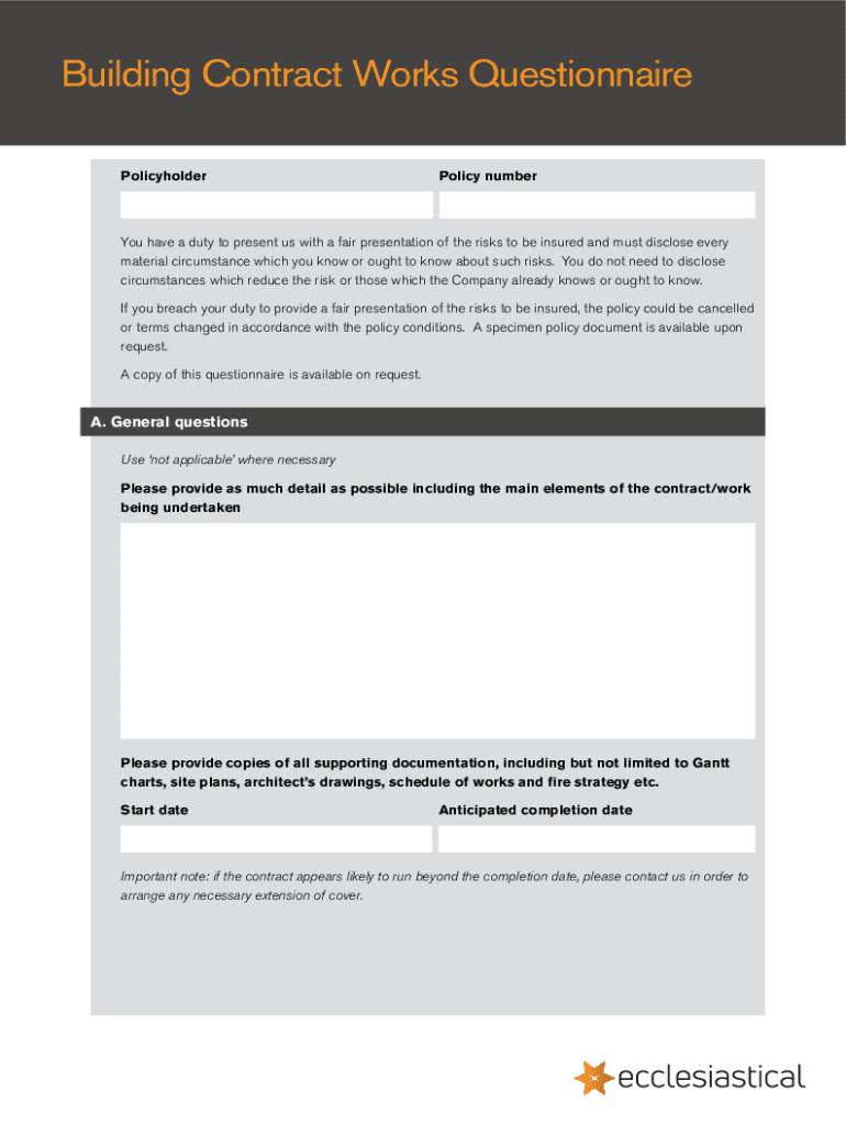 Get the free Building Contract WorksQuestionnaireEcclesiastical Insurance. Building Contract Works