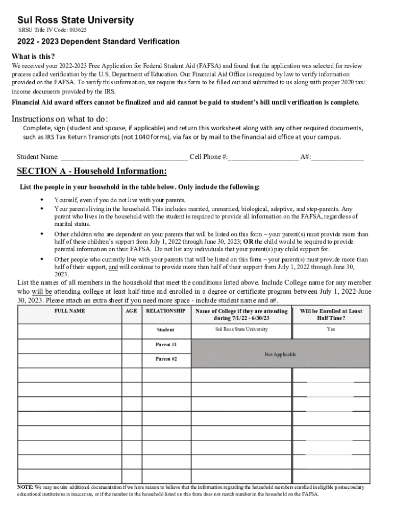 Sub Ross State University SRS Title IV Code: 0036252022 2023 Dependent Standard Verification What is this? We received your 20222023 Free Application for Federal Student Aid (FAFSA) and found that