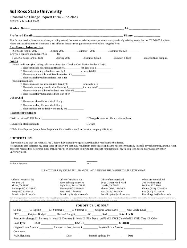 Sub Ross State University Financial Aid Change Request Form 20222023 SRS Title IV Code: 003625Student Nam e: ___ A#:___ Preferred Email: ___ Phone: ___ This form is used to increase an already existing