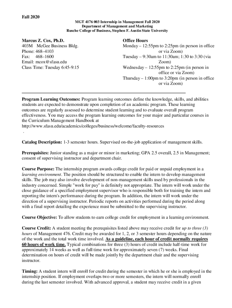 Fall 2020 MET 4176 003 Internships in Management Fall 2020 Department of Management and Marketing Rescue College of Business, Stephen F. Austin State University Marcus Z. Cox, Ph.D. 403M McGee Business