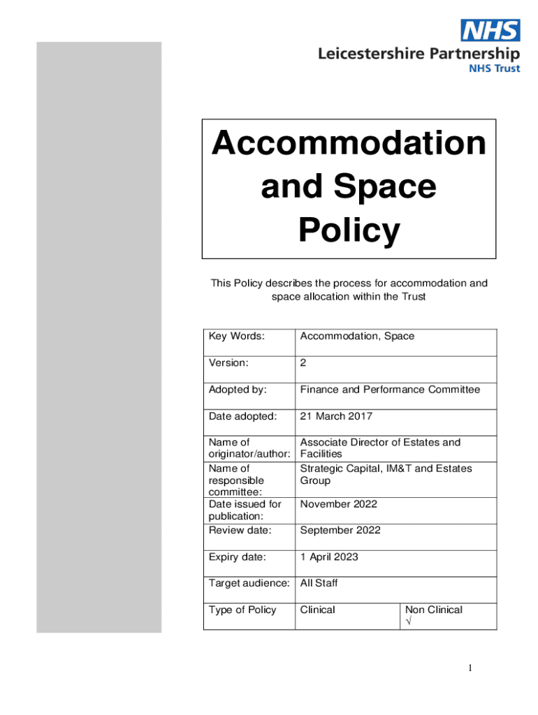 Accommodation and Space Policy This Policy describes the process for accommodation and space allocation within the Trust Keywords:Accommodation, SpaceVersion:2Adopted by:Finance and Performance Committeeman