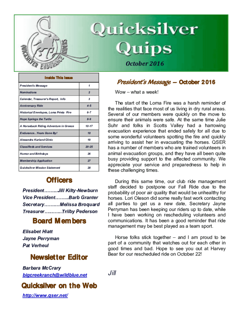 October 2016 Inside This Issue President\'s Message1Nominations2Calendar, Treasurer\'s Report, Info3Anniversary Ride45Historical Envelopes, Coma Pietà Fire67Hope Springs the Turtle89A Horseback Riding