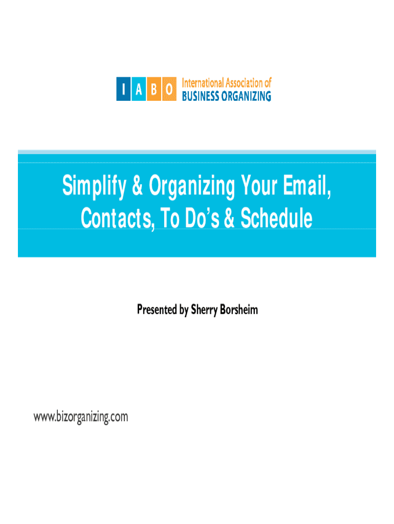 Simplify & Organizing Your Email, Contacts, To-Dos & Schedule Presented by Sherry Borsheimwww.biz organizing. Purpose for Today Create a standardized email management g system for processing and taking