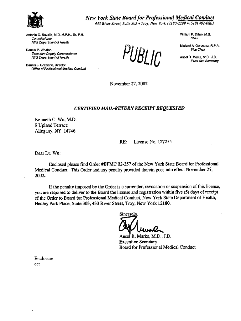 New York State Board for Professional Medical Conduct 433 River Street, Suite 303lTroy, New York 121802299l(518) 4020863William P. Dillon, M.D. Chair Antonia C. Novella, HL. D., M.P.H., Dr. P.H. Commissioner
