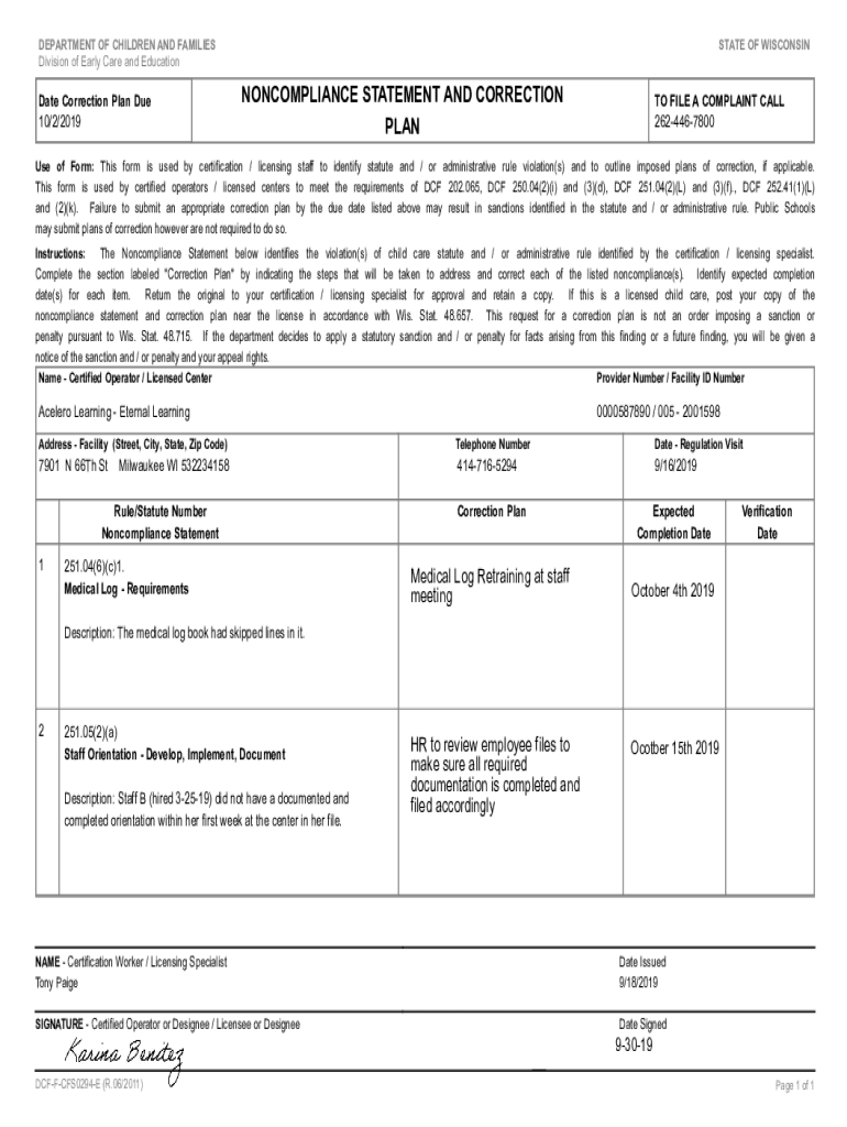 DEPARTMENT OF CHILDREN AND FAMILIES Division of Early Care and Educational Correction Plan Due 10/2/2019STATE OF WISCONSINNONCOMPLIANCE STATEMENT AND CORRECTION PLANT FILE A COMPLAINT CALL 2624467800Use