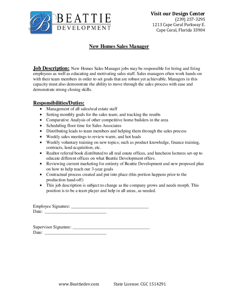 Visit our Design Center (239) 2573295 1213 Cape Coral Parkway E. Cape Coral, Florida 33904New Homes Sales Manager Job Description: New Homes Sales Manager jobs may be responsible for hiring and firing
