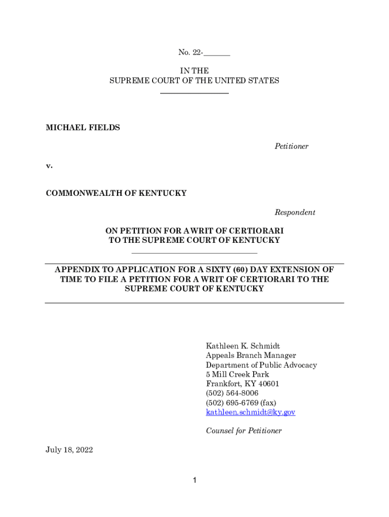No. 22___ IN THE SUPREME COURT OF THE UNITED STATES ___MICHAEL FIELDS Petitioner v. COMMONWEALTH OF KENTUCKY Respondent ON PETITION FOR A WRIT OF CERTIORARI TO THE SUPREME COURT OF KENTUCKY ___ APPENDIX