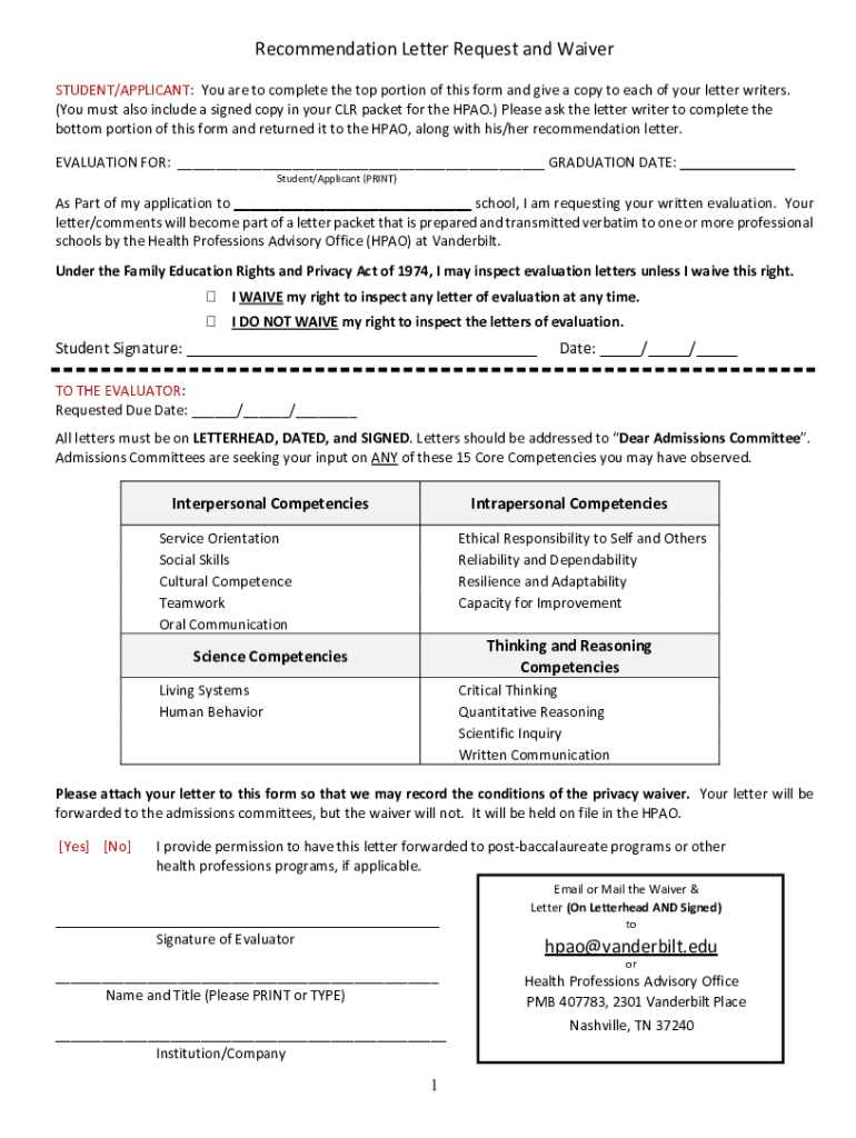 Recommendation Letter Request and Waiver STUDENT/APPLICANT: You are to complete the top portion of this form and give a copy to each of your letter writers. (You must also include a signed copy in