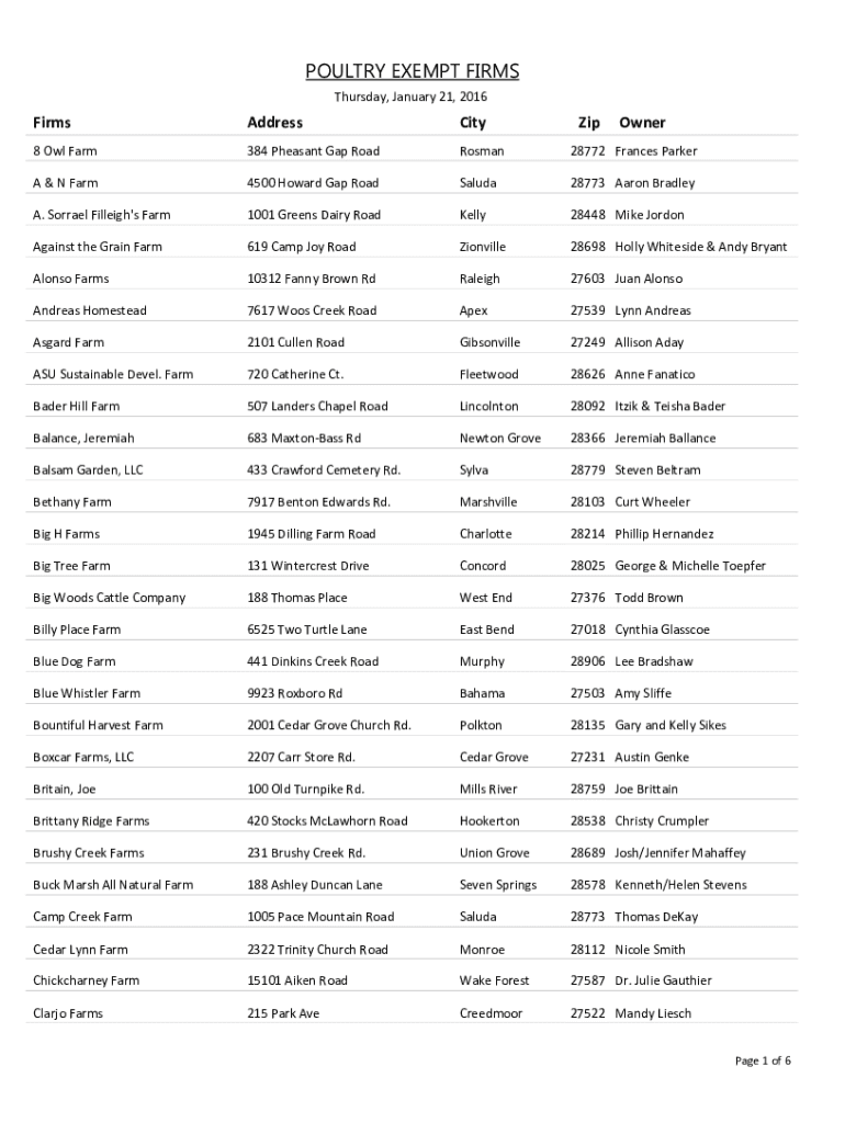 POULTRY EXEMPT FIRMS Thursday, January 21, 2016FirmsAddressCityZipOwner8 Owl Farm384 Pheasant Gap RoadRosman28772 Frances Parker & N Farm4500 Howard Gap RoadSaluda28773 Aaron Bradley. Sorrel Village\'s