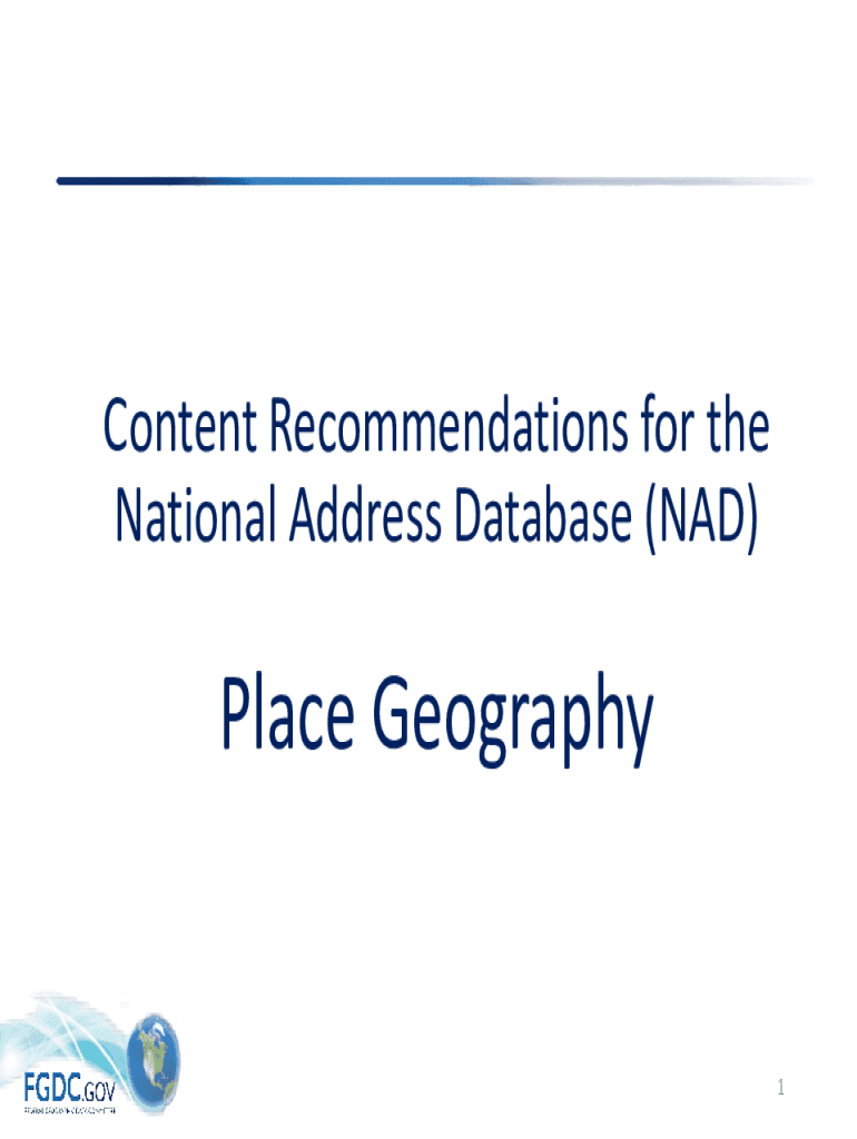 Content Recommendations for the National Address Database (NAD)Place Geography1Why Include Geography in NAD? Technically not required Can derive any geography for address points by point/polygon relationships
