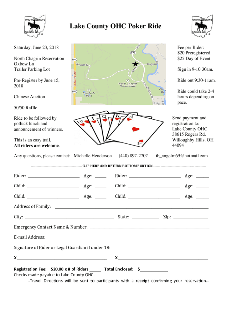 Lake County OH Poker Ride Saturday, June 23, 2018Fee per Rider: $20 Preregistered $25 Day of Event North Chagrin Reservation Oxbow Ln Trailer Parking Losing in 910:30am. Preregister by June 15, 2018Ride