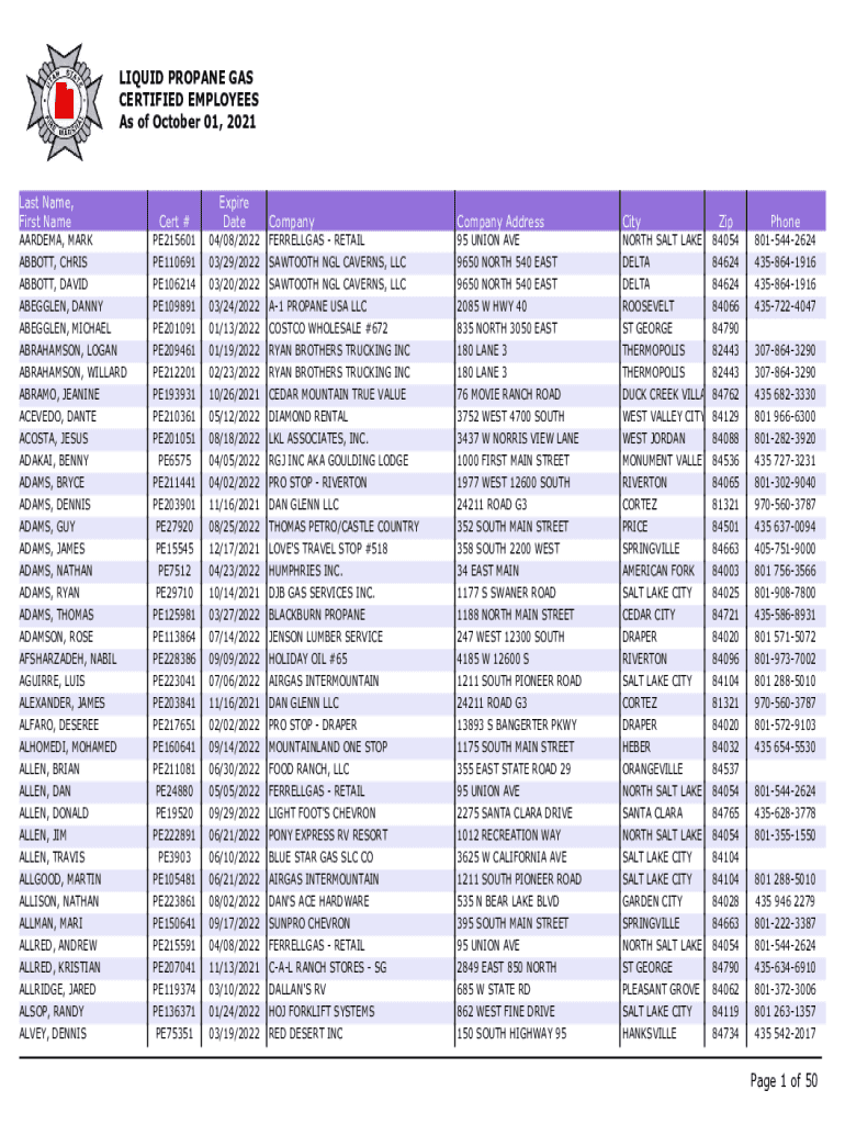 LIQUID PROPANE GAS CERTIFIED EMPLOYEES As of October 01, 2021Last Name, First Lambert #Expire DateCompanyCompany AddressCityAARDEMA, MARK ABBOTT, CHRIS ABBOTT, DAVID ABERDEEN, DANNY ABERDEEN, MICHAEL