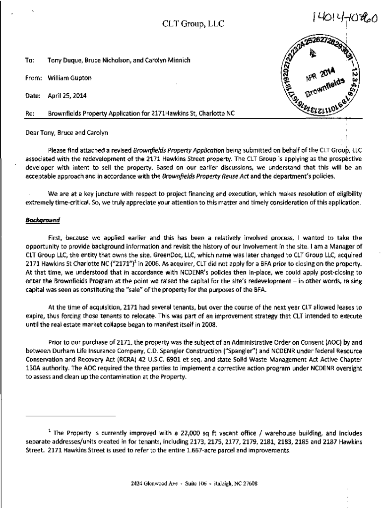 CLT Group, Plato:Tony Tuque, Bruce Nicholson, and Carolyn MinnichFrom:William GuptonDate:April 25, 2014Re:Brownfield Property Application for 2171Hawkins St, Charlotte NC1L/OT L/! Oil, () ! Dear Tony,