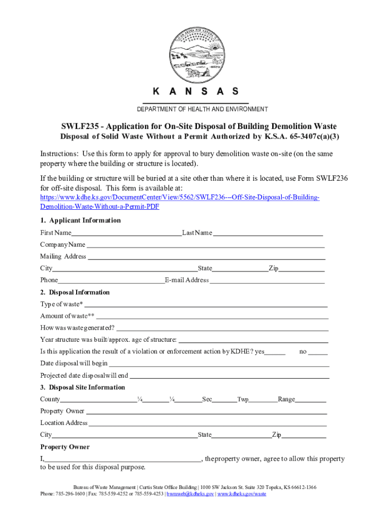 DEPARTMENT OF HEALTH AND ENVIRONMENTSWLF235 Application for Onsite Disposal of Building Demolition WasteDisposal of Solid Waste Without a Permit Authorized by K.S.A. 653407c(a)(3) Instructions: Use