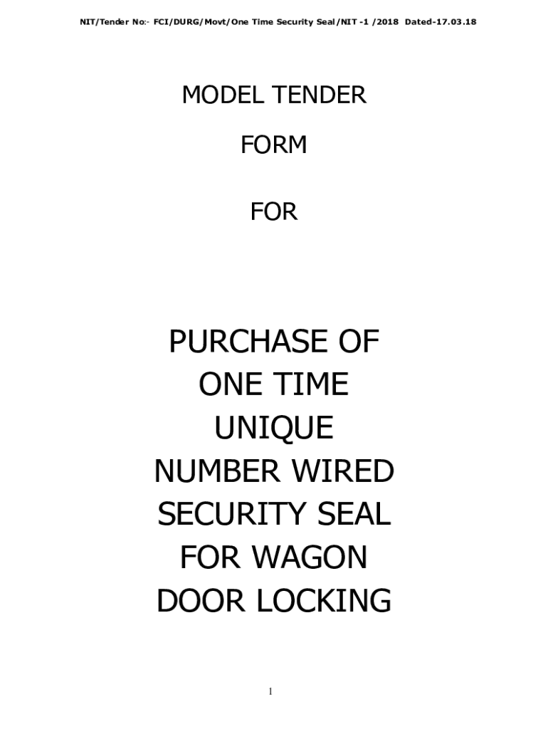 NIT/Tender No: FCI/DUG/Most/One Time Security Seal/NIT 1 /2018 Dated17.03.18MODEL TENDER FORM PURCHASE OF ONE TIME UNIQUE NUMBER WIRED SECURITY SEAL FOR WAGON DOOR LOCKING 1NIT/Tender No: FCI/DUG/Most/One