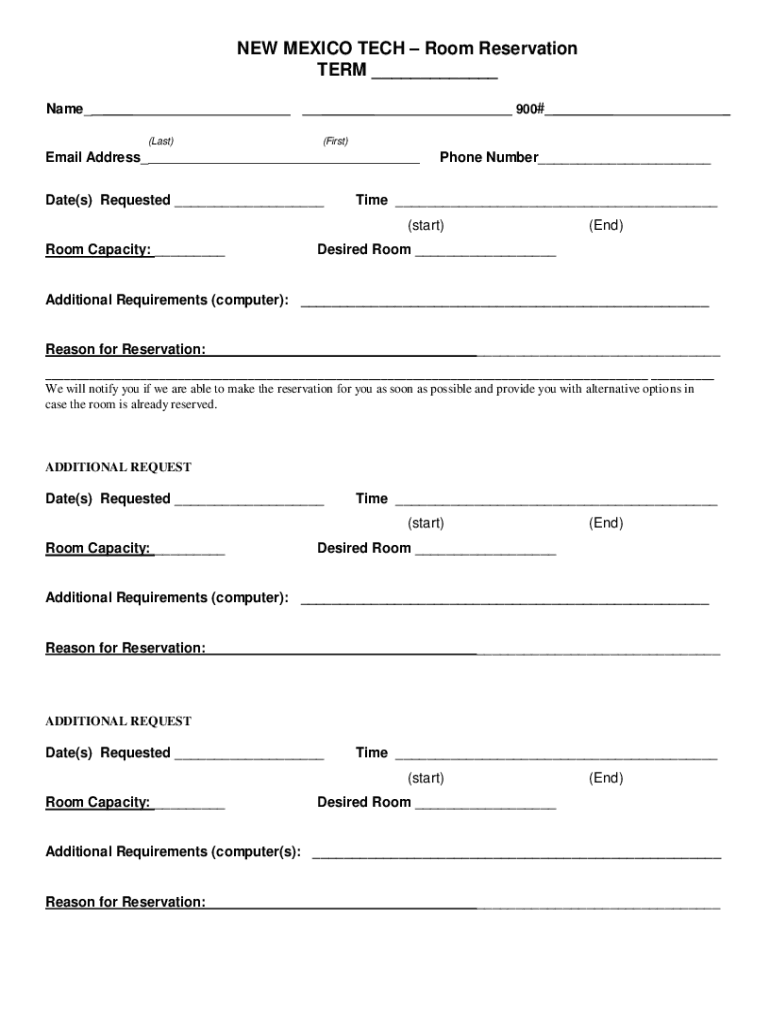 NEW MEXICO TECH Room Reservation TERM ___ Name_ ______ (Last)900# ___(First)Email Address___ Date(s) Requested ___Phone Number___Time ___ (start)Room Capacity: ___(End)Desired Room ___Additional Requirements
