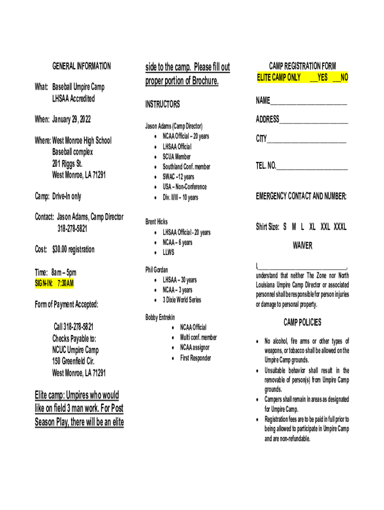 Get the free Elite camp: Umpires who would like on field 3 man ... - LHSAA