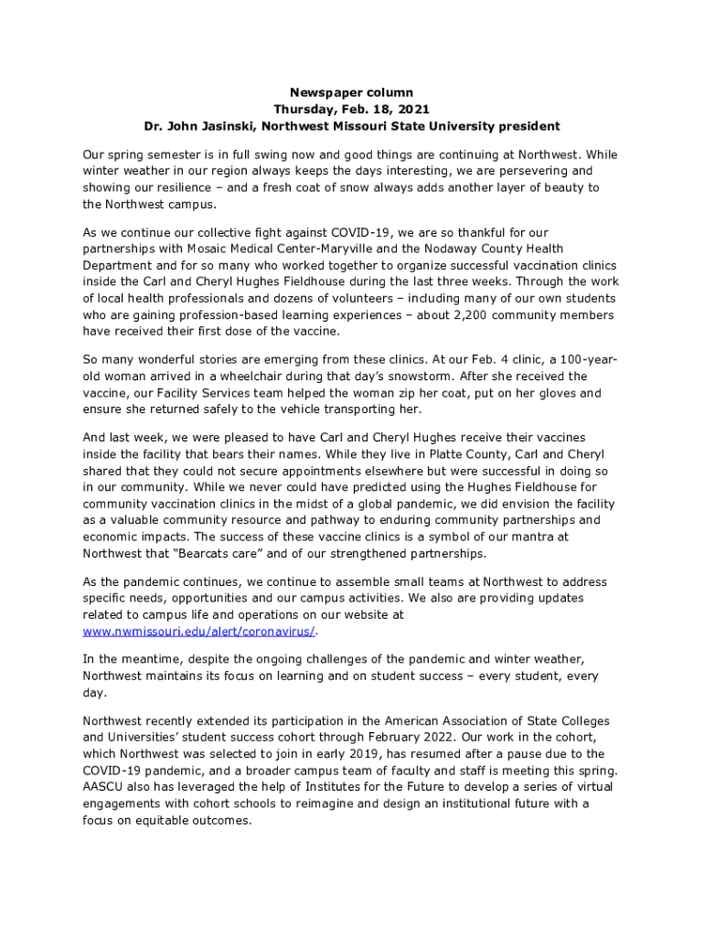 Newspaper column Thursday, Feb. 18, 2021 Dr. John Babinski, Northwest Missouri State University president Our spring semester is in full swing now and good things are continuing at Northwest. While