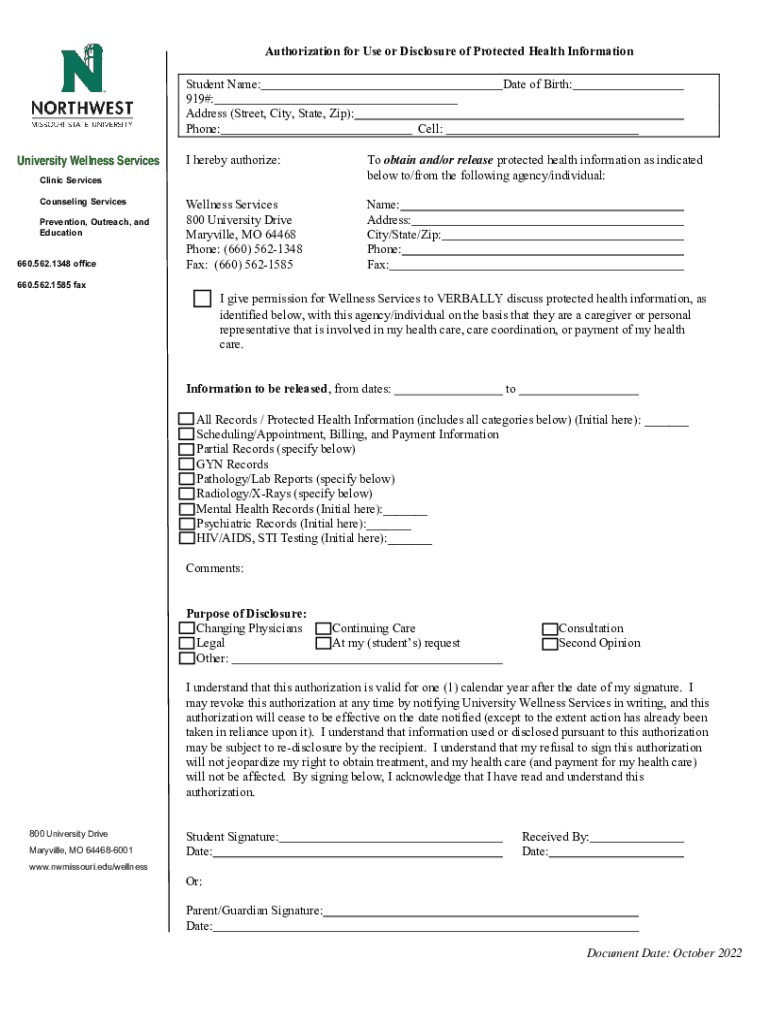 Authorization for Use or Disclosure of Protected Health Information Student Name: 919#: Address (Street, City, State, Zip): Phone: University Wellness ServicesPrevention, Outreach, and Education 660.562.1348