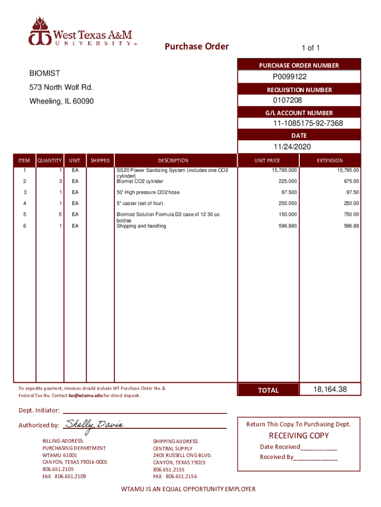 Purchase Order1 of 1 PURCHASE ORDER NUMBERBIOMISTP0099122573 North Wolf Rd. REQUISITION NUMBER0107208Wheeling, IL 60090G/L ACCOUNT NUMBER111085175927368 DATE11/24/2020 ITEMQUANTITYUNITSHIPPEDDESCRIPTION11EA23EASS20