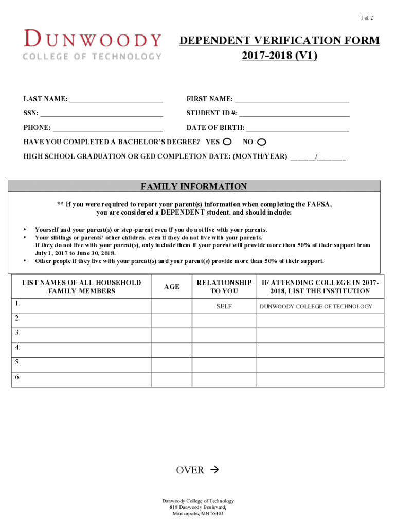 1 of 2DEPENDENT VERIFICATION FORM 20172018 (V1)LAST NAME:FIRST NAME:SSN:STUDENT ID #:PHONE:DATE OF BIRTH:HAVE YOU COMPLETED A BACHELORS DEGREE? YESNOHIGH SCHOOL GRADUATION OR GED COMPLETION DATE: