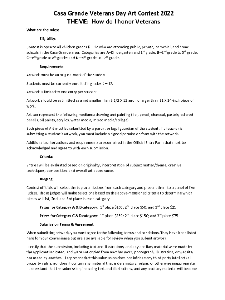 Casa Grande Veterans Day Art Contest 2022 THEME: How do I honor Veterans What are the rules: Eligibility: Contest is open to all children grades K 12 who are attending public, private, parochial,