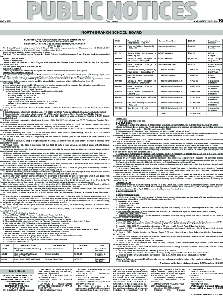 PUBLIC NOTICESJUNE 16, 2022CountyStar.comISANTICHISAGO COUNTY STAR19NORTH BRANCH SCHOOL BOARD NORTH BRANCH INDEPENDENT SCHOOL DISTRICT NO. 138 REGULAR SCHOOL BOARD MEETING NORTH BRANCH AREA EDUCATION