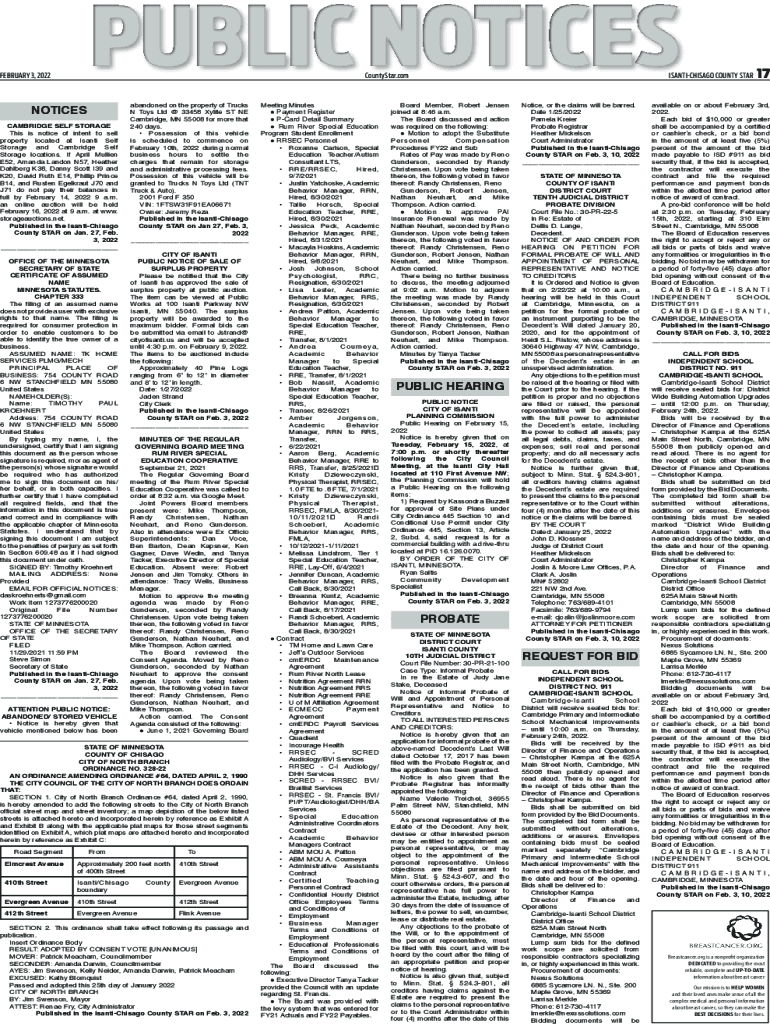 PUBLIC NOTICESFEBRUARY 3, 2022CountyStar. Counties CAMBRIDGE SELF STORAGE This is notice of intent to sell property located at Is anti-Self Storage and Cambridge Self Storage locations. If April Mullen