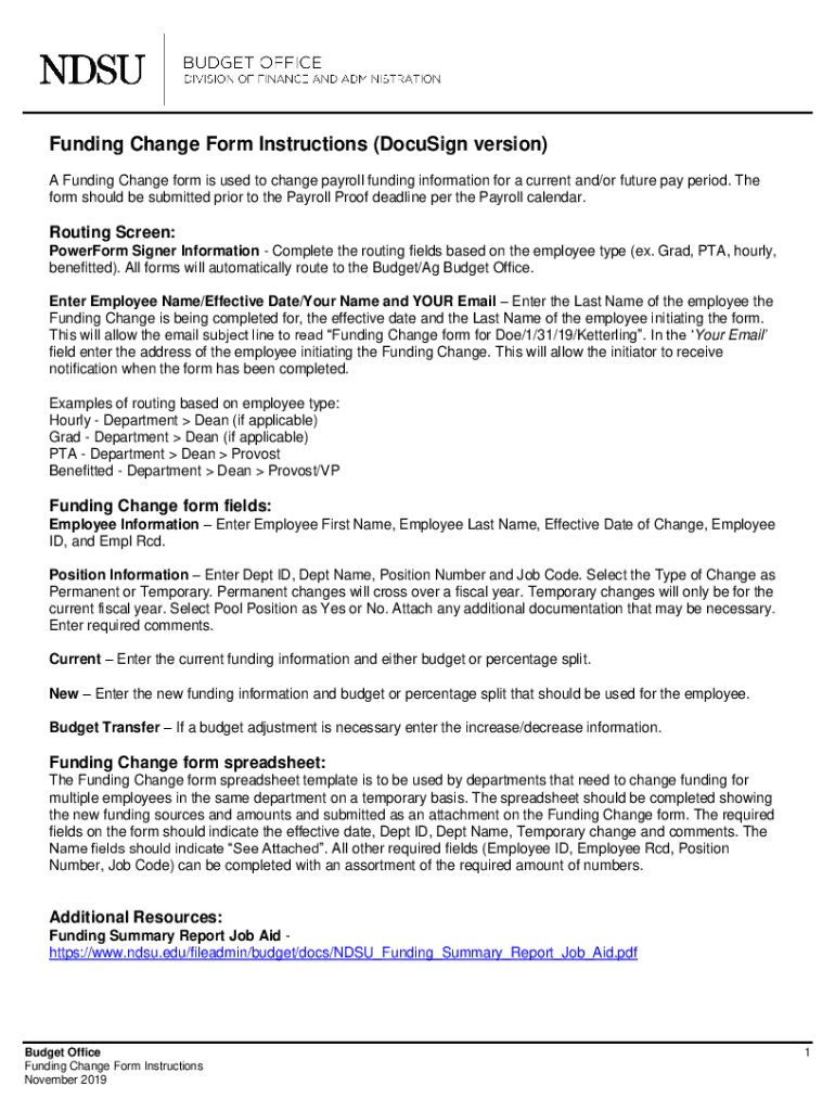 Funding Change Form Instructions (DocuSign version) A Funding Change form is used to change payroll funding information for a current and/or future pay period. The form should be submitted prior to