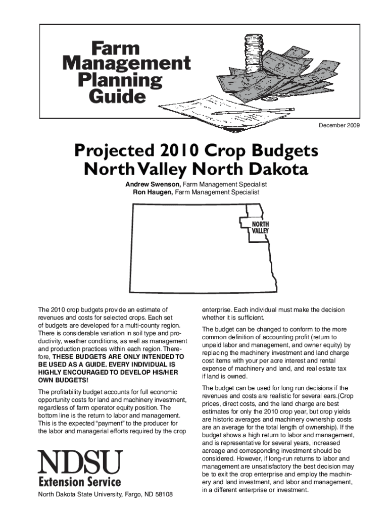 December 2009Projected 2010 Crop Budgets North Valley North Dakota Andrew Swanson, Farm Management Specialist Ron Hagen, Farm Management Specialist 2010 crop budgets provide an estimate of revenues