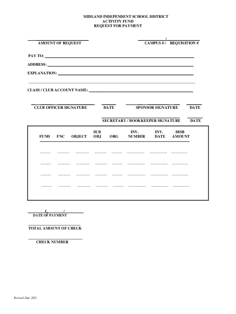 MIDLAND INDEPENDENT SCHOOL DISTRICT ACTIVITY FUND REQUEST FOR PAYMENT ______/___AMOUNT OF REQUESTCAMPUS # /REQUISITION #PAY TO: ___ ADDRESS: ___ EXPLANATION: ___ ___CLASS / CLUB ACCOUNT NAME: ___