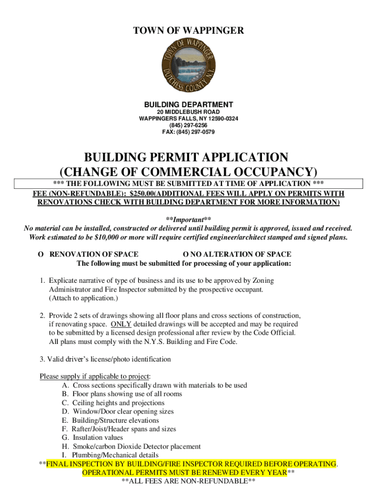 TOWN OF WAPPINGERBUILDING DEPARTMENT 20 MIDDLEBURY ROAD HAPPINESS FALLS, NY 125900324 (845) 2976256 FAX: (845) 2970579BUILDING PERMIT APPLICATION (CHANGE OF COMMERCIAL OCCUPANCY) *** THE FOLLOWING