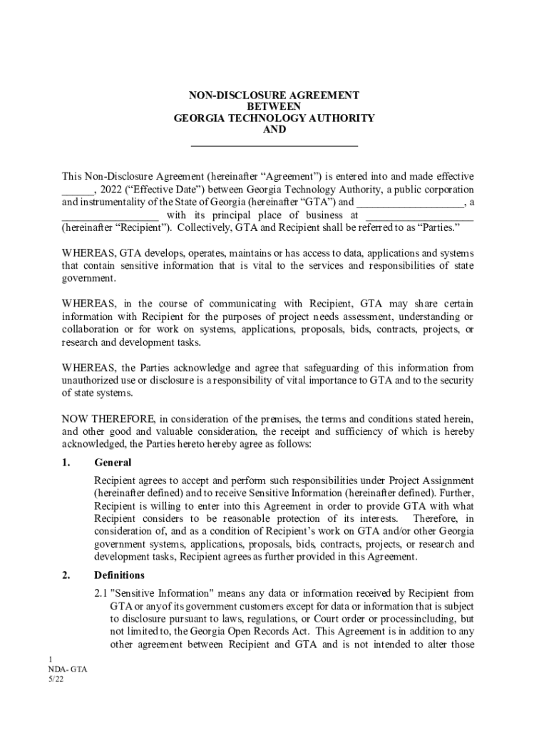 NONDISCLOSURE AGREEMENT BETWEEN GEORGIA TECHNOLOGY AUTHORITY AND ___ This Nondisclosure Agreement (hereinafter Agreement) is entered into and made effective ___, 2022 (Effective Date) between Georgia