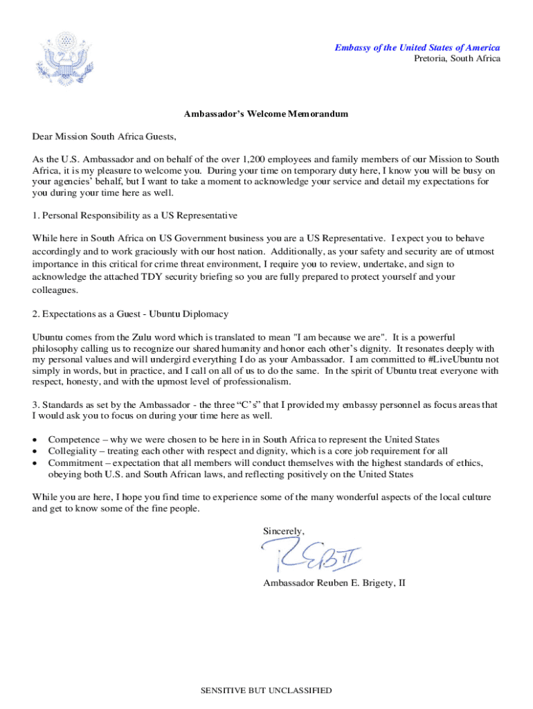 Embassy of the United States of America Pretoria, South AfricaAmbassadors Welcome MemorandumDear Mission South Africa Guests, As the U.S. Ambassador and on behalf of the over 1,200 employees and family