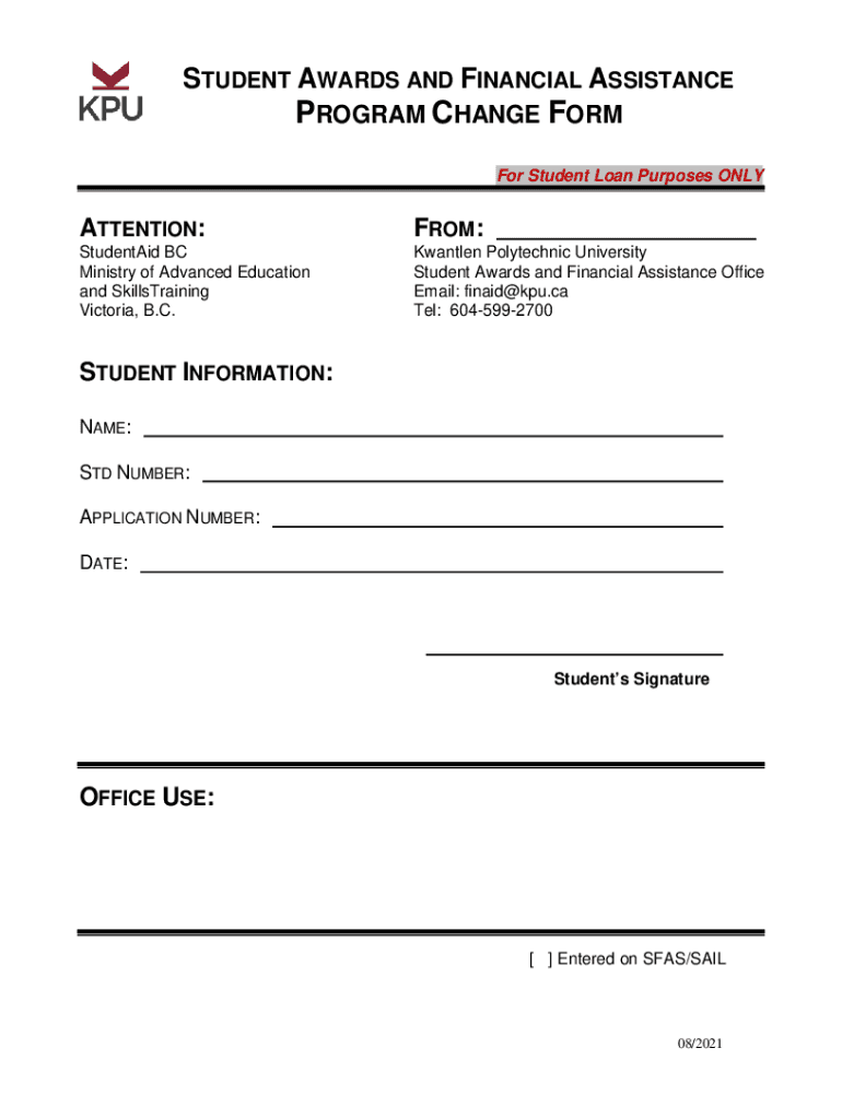 STUDENT AWARDS AND FINANCIAL ASSISTANCEPROGRAM CHANGE FORM For Student Loan Purposes INATTENTION:FROM: ___Students BC Ministry of Advanced Education and SkillsTraining Victoria, B.C. Wanted Polytechnic