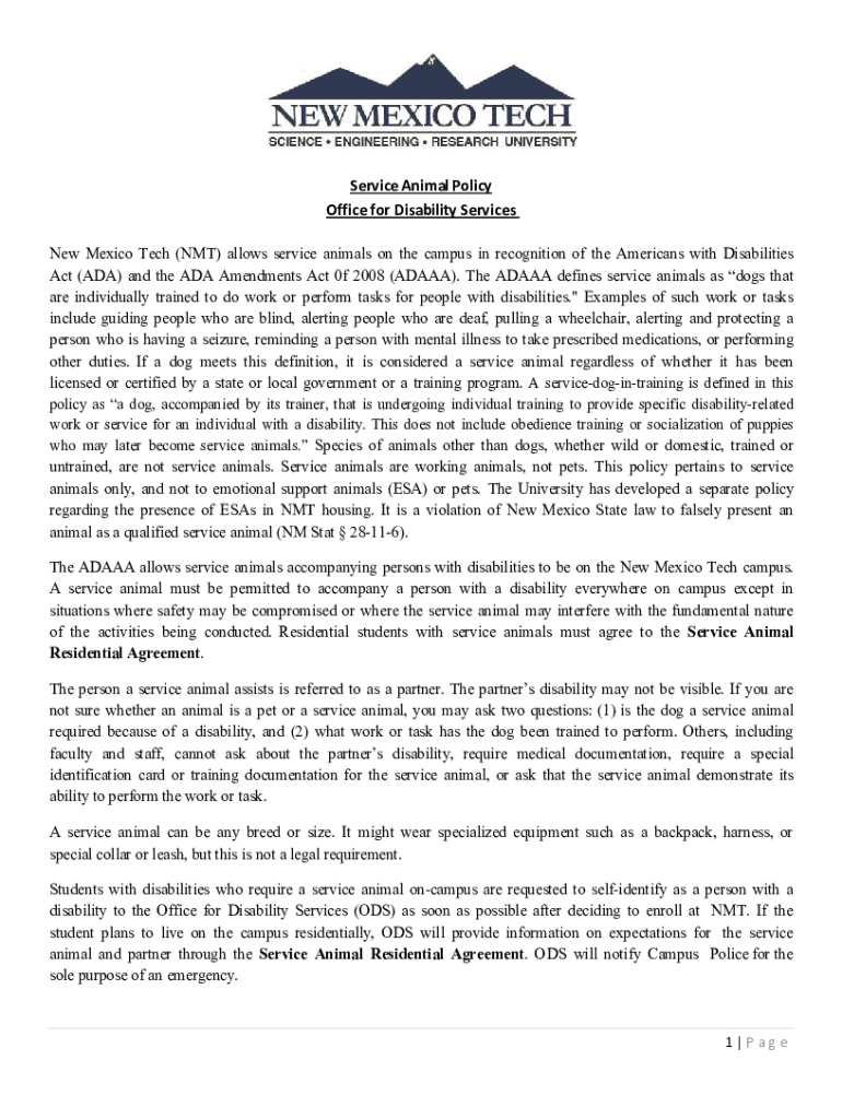 Service Animal Policy Office for Disability Services New Mexico Tech (NMT) allows service animals on the campus in recognition of the Americans with Disabilities Act (ADA) and the ADA Amendments Act