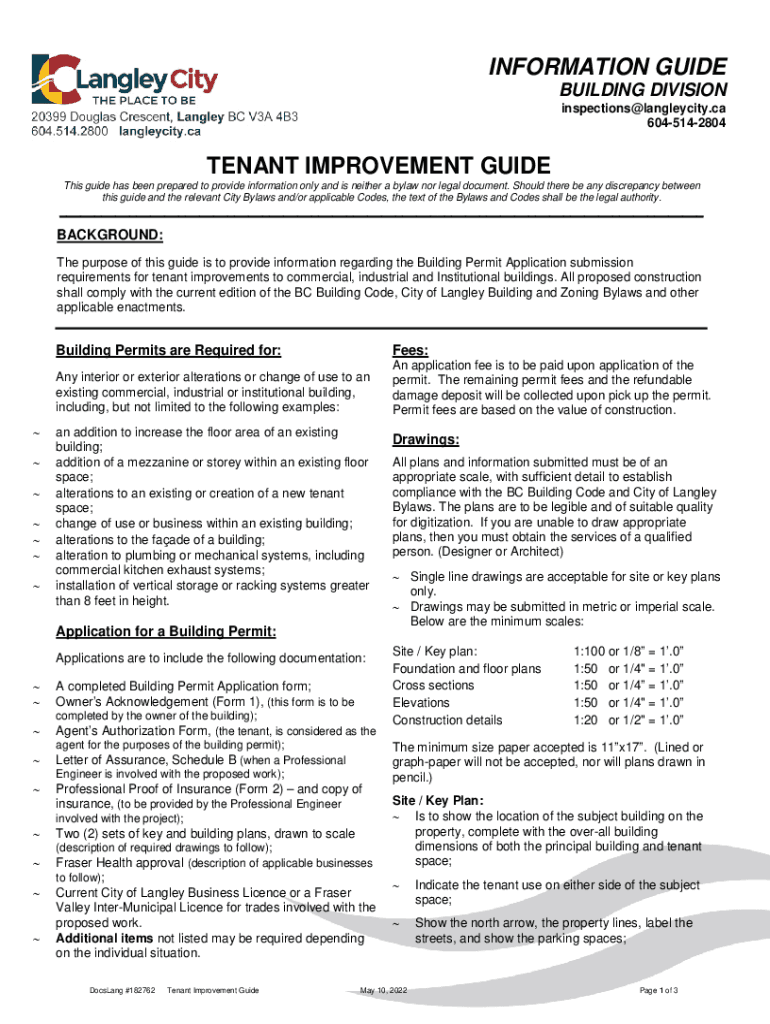 INFORMATION GUIDE BUILDING DIVISION inspections@langleycity.ca 6045142804TENANT IMPROVEMENT GUIDE This guide has been prepared to provide information only and is neither a bylaw nor legal document.