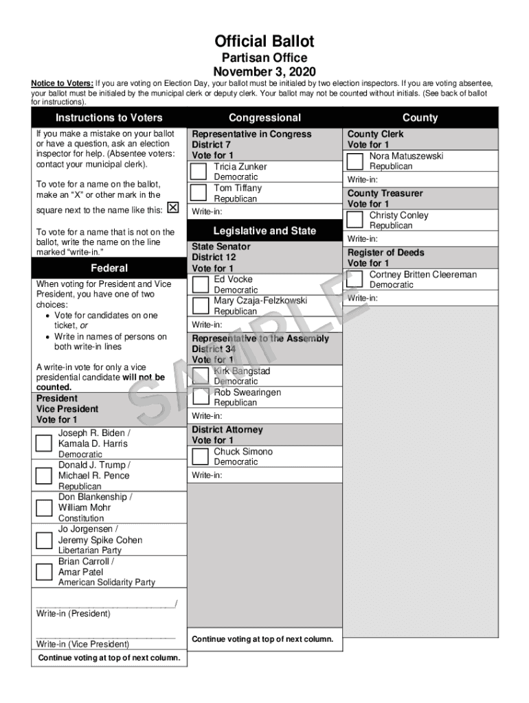 Official Ballot Partisan Office November 3, 2020, Notice to Voters: If you are voting on Election Day, your ballot must be initialed by two election inspectors. If you are voting absentee, your ballot